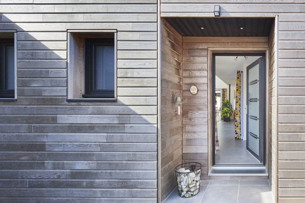 Cette maison à ossature bois joue sur les cubes et les volumes pour une architecture contemporaine très réussie. Le bois, omniprésent dans sa teinte Red Cedar, plonge ses habitants dans un habitat « nature »; avec une seule consigne : plaisir de vivre !
